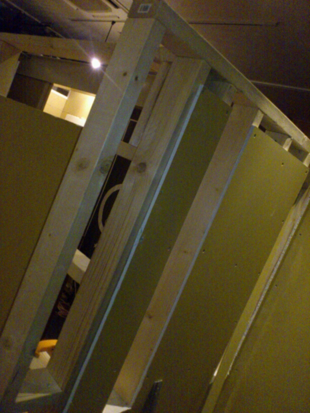 と、このように縦だけで十分かと思いきや強度的に不安になってきたので、石膏ボードの継ぎ目と真ん中あたりに横の支えを後で入れました。