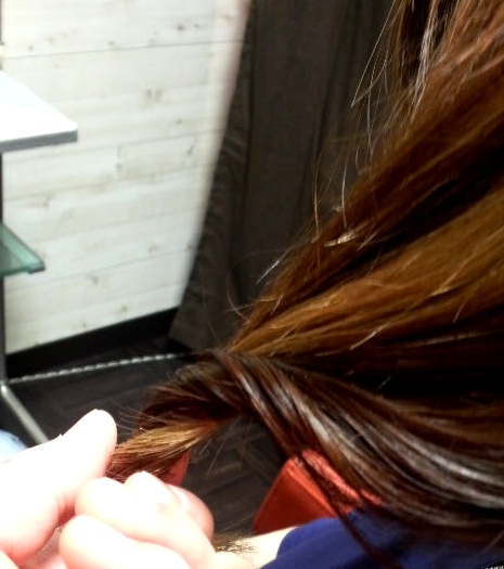 毛束を中間から毛先にスライドしながらねじり・・・